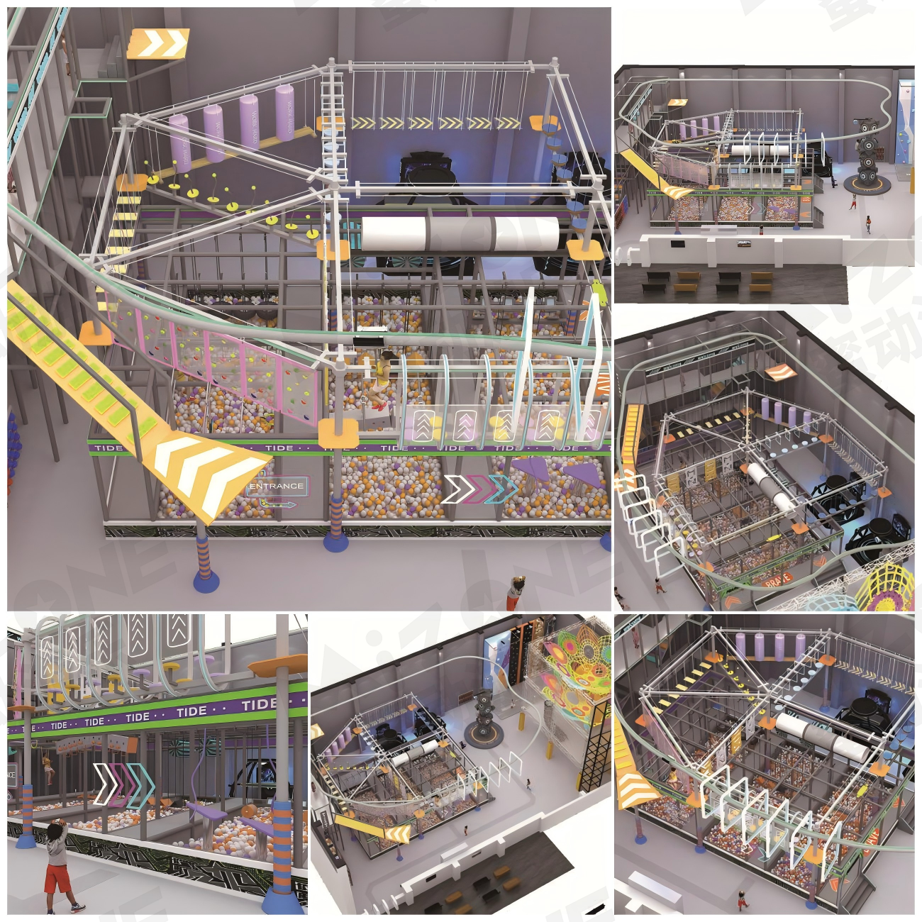彩色魔网如梦幻织锦般铺展开来,紧邻其旁,魔方攀岩墙以斑斓色彩诱惑着攀登者的心,难度各异,挑战无限。动感十足,每一处都散发着运动的魅力与活力,无论是大人还是孩子,都能在这里找到属于自己的乐趣与挑战。