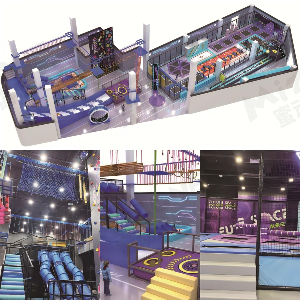面积:1000m² | 地点:江西·吉安 以蓝色、紫色和荧光色为主,让人一进门就感受到满满的活力和欢乐。在这里,你可以挑战攀岩墙体验攀登的乐趣;也可以跳进球池尽情享受翻滚的快乐;更可以在蹦床上跳跃释放内心的活力。
