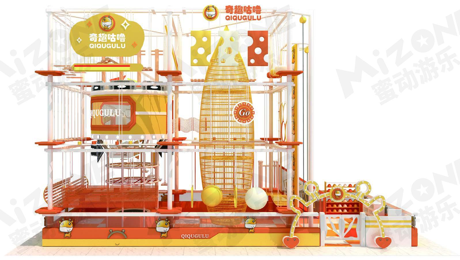 面积:60m² | 地点:广东·东莞 踏入”奇趣咕噜”中庭,黄橙色活力四溢!高空拓展区,黄橙钢架跃动青春。黄色魔网,悬空挑战乐无穷。这里,色彩明亮,活力满满,是勇者的天地,也是欢乐的海洋。快来加入,释放活力,尽享运动之乐!