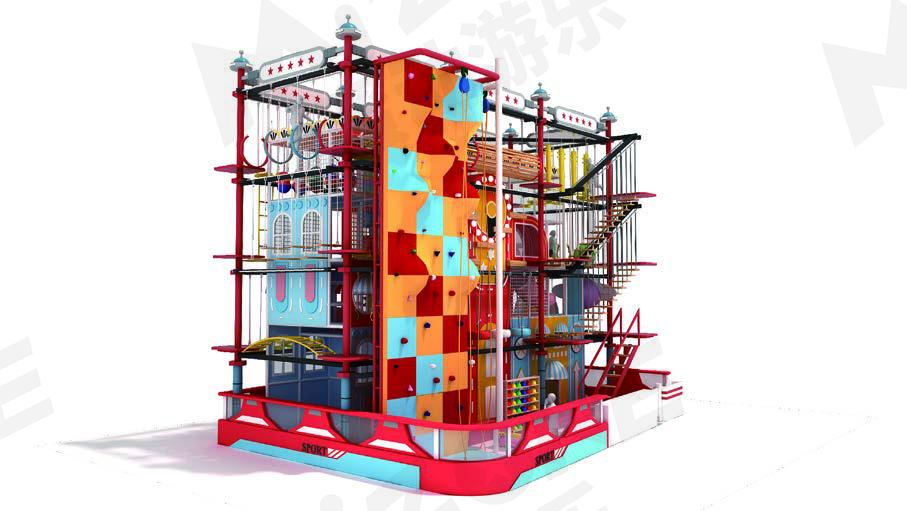 中庭拓展设计简直是一场视觉与感官的盛宴!炽热的红色如火焰般燃烧,激发着每一位探索者的热情与勇气,仿佛踏入了一个充满动感的红色世界。蓝如天空,黄似阳光,这两种颜色巧妙地交织在这片空间里,为整个设计增添了一抹梦幻而充满活力的色彩。