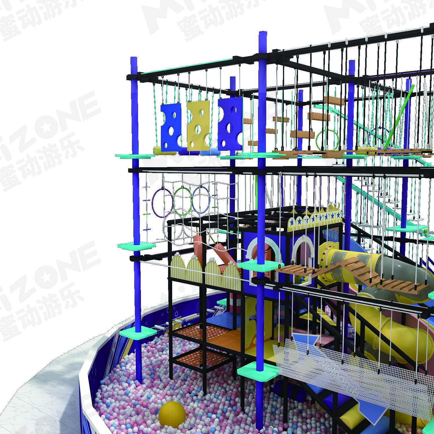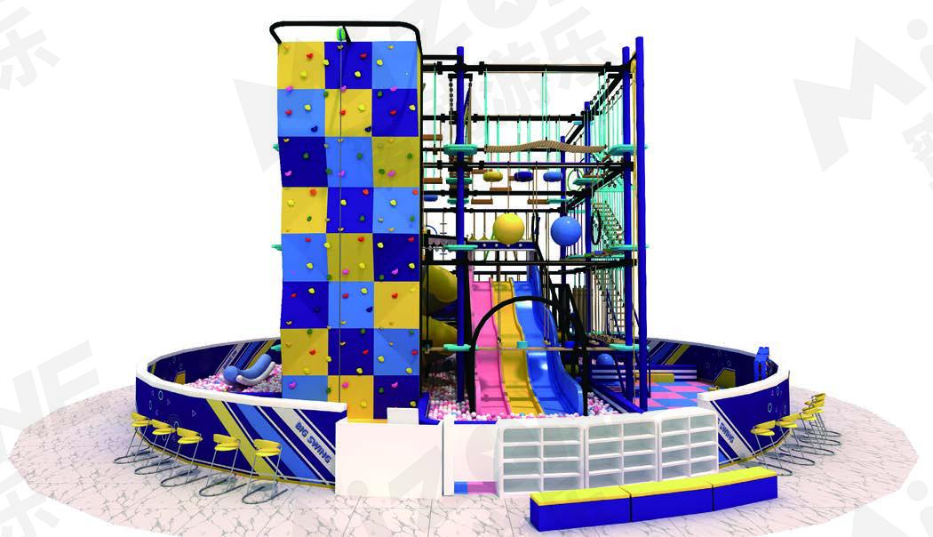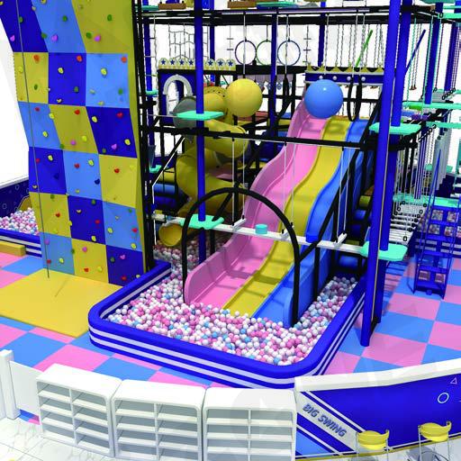 面积:80m² | 地点:陕西 | 西安 圆形中庭以紫色为主调,营造出神秘梦幻的氛围。高空拓展区域环绕球池,黄色螺旋滑梯盘旋而下。抱石攀岩墙成为勇敢者的试炼场。紫色海洋中点缀蓝黄,营造独特运动空间,让人跃跃欲试。