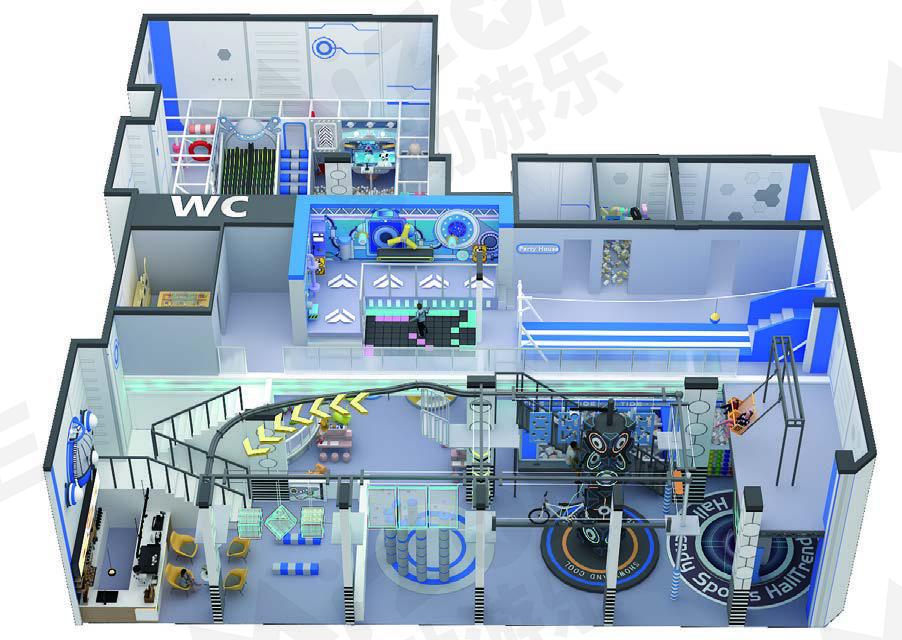 这款室内高空淘气堡以灰蓝为主色调,现代科技感融合童趣。设有高空拓展、喇叭滑梯、梅花桩、滑索区等,还有蹦床、攀岩及超级玛丽主题区,乐趣无穷。