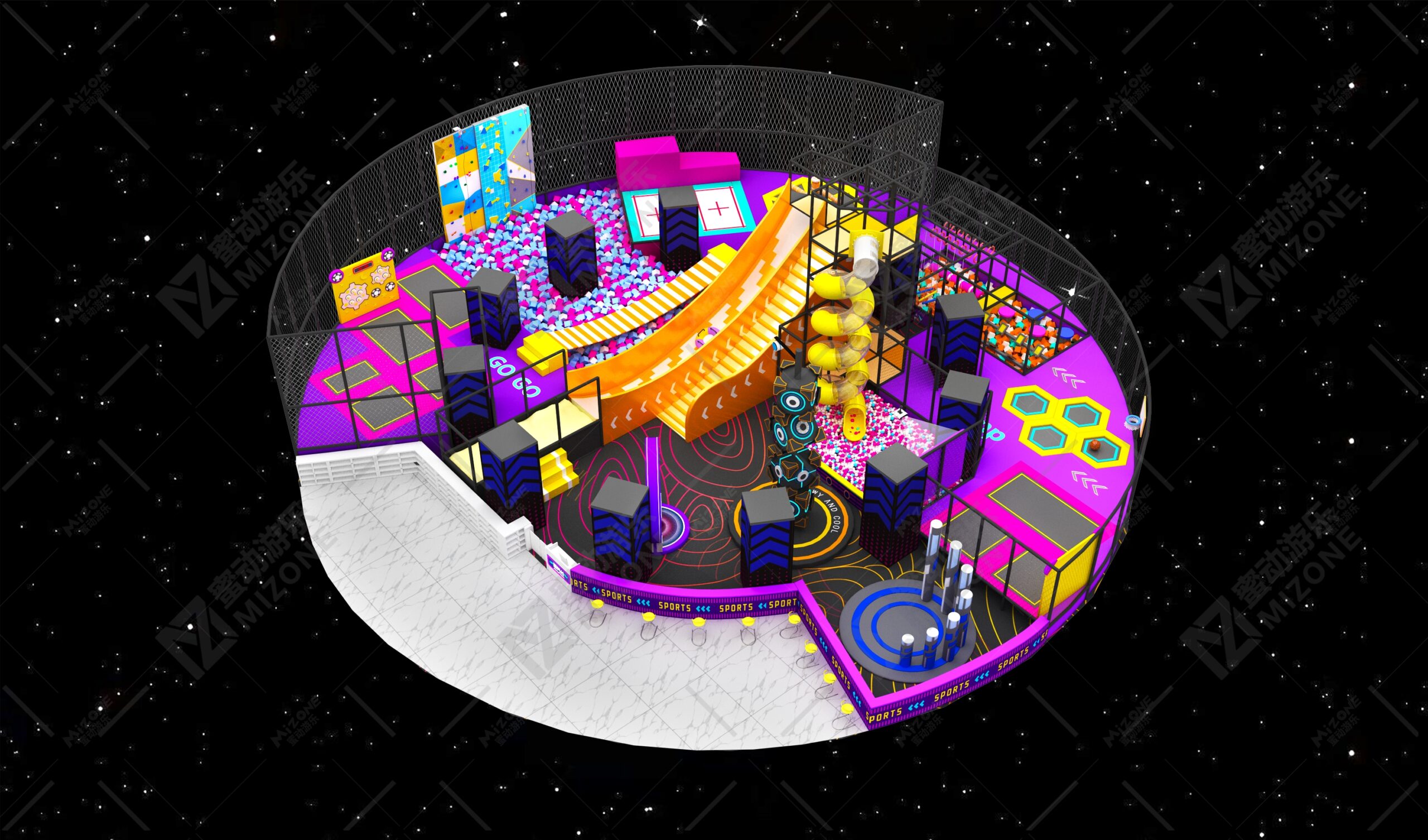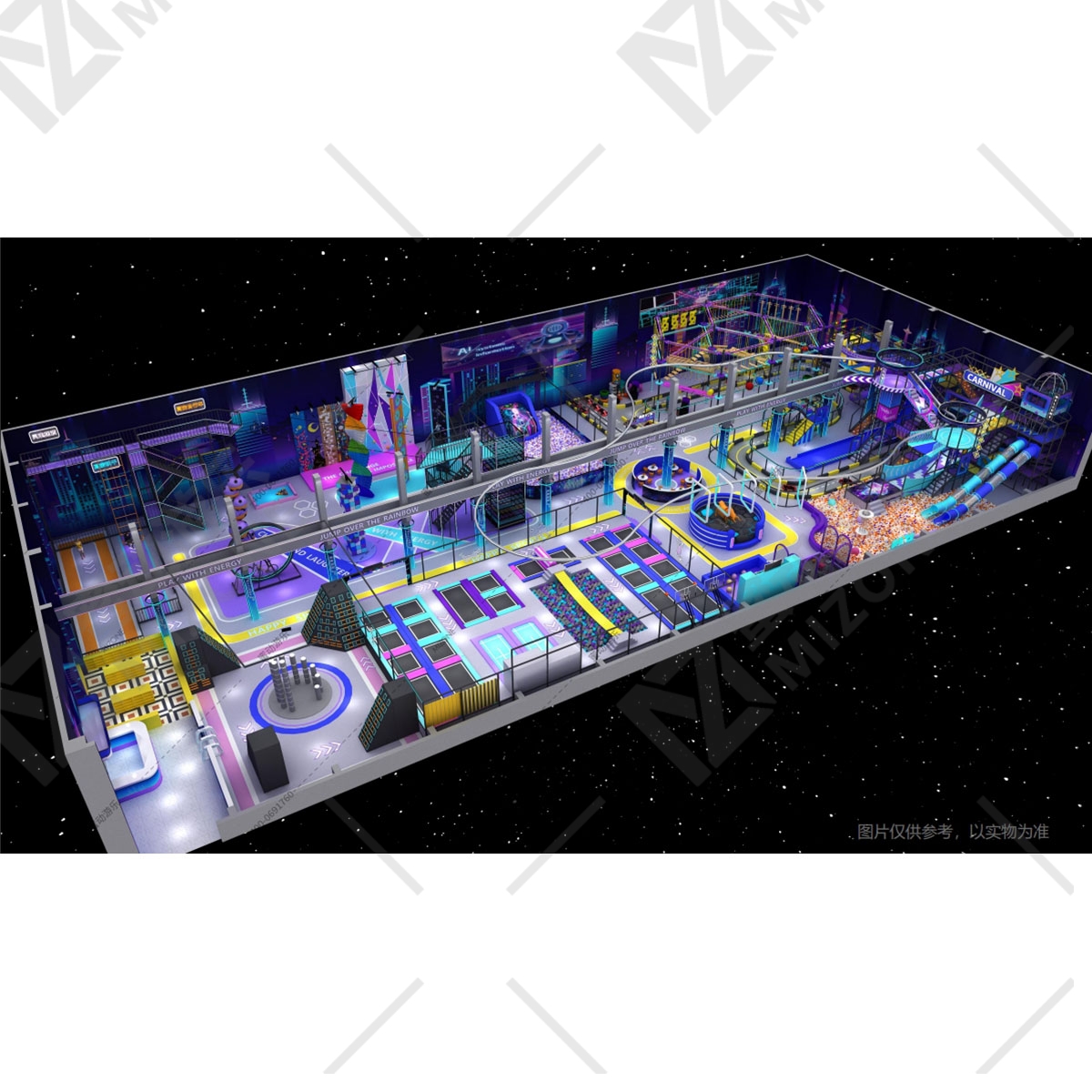 我们在广东佛山有近万平生产基地,从设计到售后全流程自己把控。不同于那些只卖设备的中间商,我们更懂怎么帮投资者把场馆做盈利。光在徐州,我们就为嗨玩岛打造过2400㎡的运动馆,从规划时的空间利用到开业后的运营策略,全程陪着客户落地。