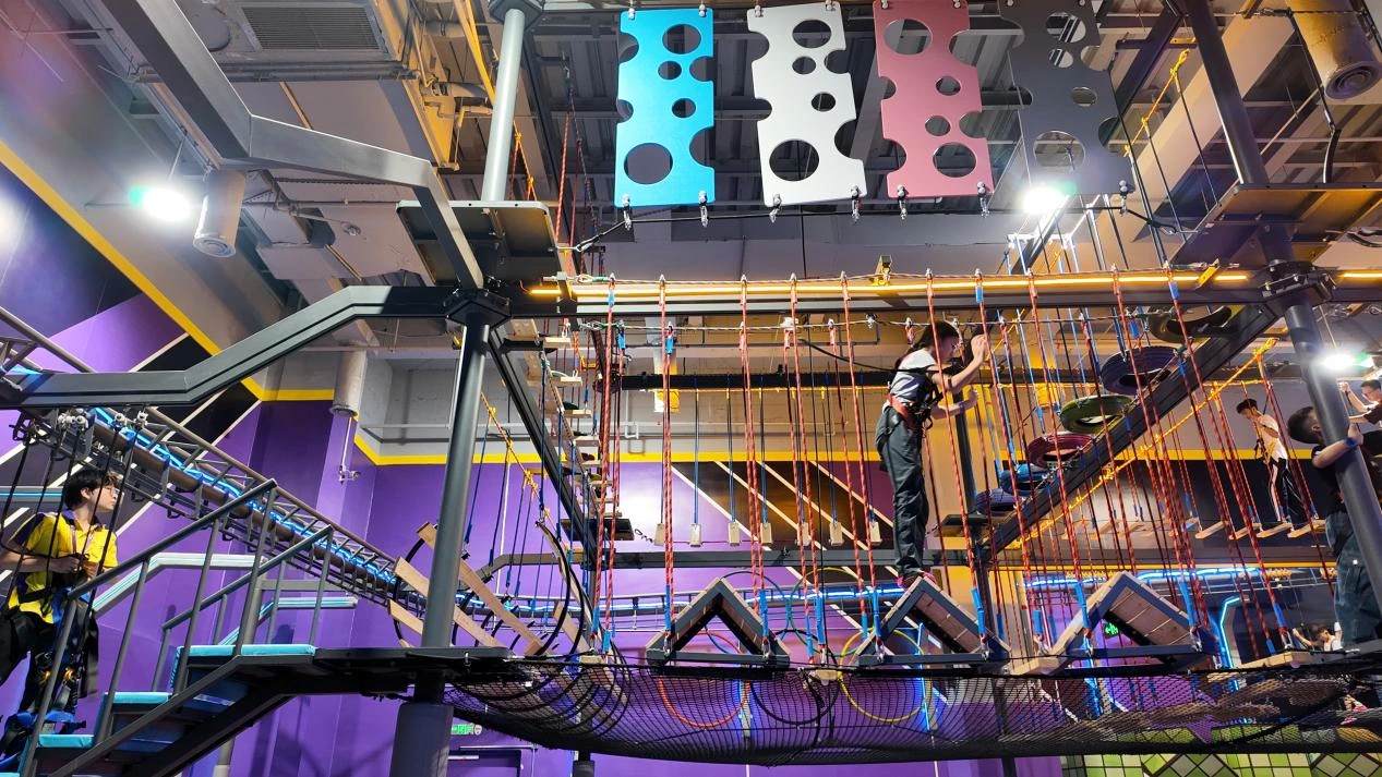 轨道中间穿插高空拓展区,爬网、平衡木等项目形成“亲子互动场景”,1块空间实现“成人刺激体验+儿童能力锻炼”的双重需求,彻底解决传统乐园“功能分区浪费”的痛点。