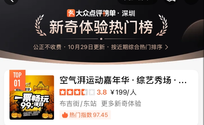 从开业当天4000人体验,开业当月销售额超500万,至今2个月过去,依然有着非常强劲的盈利能力,近期团购额近450万,高居同类场馆的团购榜首和深圳的新奇体验热门榜榜首,足见此次项目的成功。