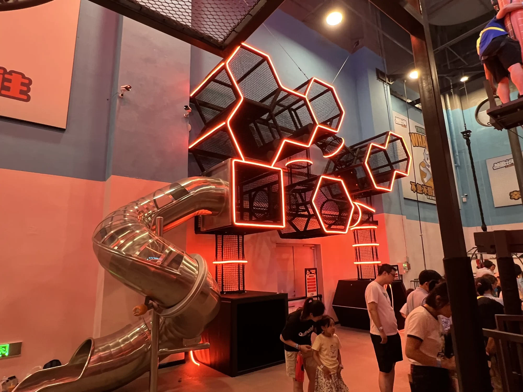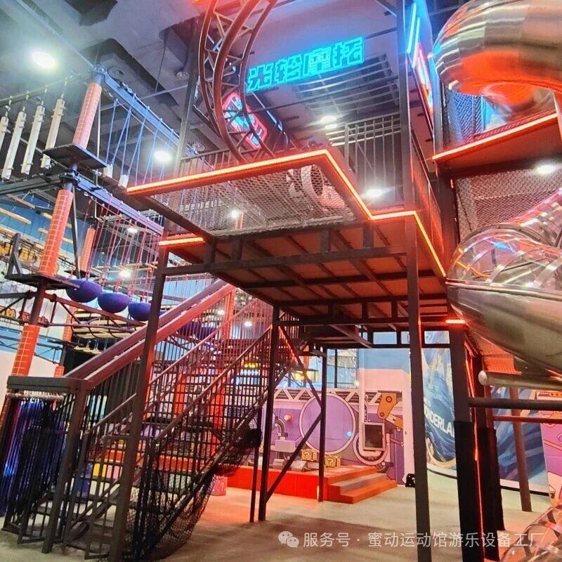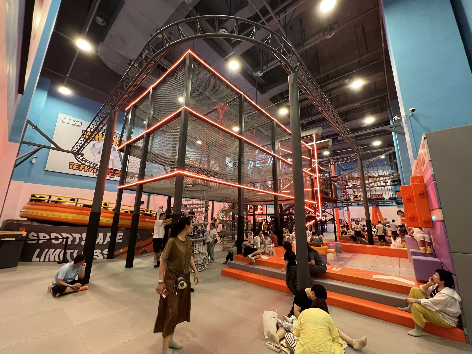 鲸鱼出海的成功,离不开其精选的各类设备,它们不仅独具特色,还根据不同年龄段游客的需求进行了定制。无论是家庭游客,还是挑战自我的年轻人,都能在这里找到属于自己的那份快乐。01量子迁跃:通过13米的挑高空间实现垂直穿梭,成为家庭游客的必玩项,适合各个年龄段的参与。02光轮摩托:刺激的赛车模拟体验,搭配赛博朋克赛道灯光,吸引了大量年轻人,成为最受欢迎的打卡项目。03机械闯关:家长与孩子的互动项目,既能增进亲子关系,也能提高合作能力。04反向蹦极:高空弹射带来的瞬间刺激,专为寻求挑战和肾上腺素的人群设计。05魔方攀岩:专为所有年龄段设计的攀岩墙,兼具趣味性与挑战性,既适合新手,也能满足进阶玩家的需求。