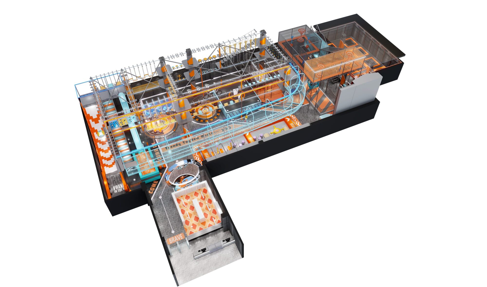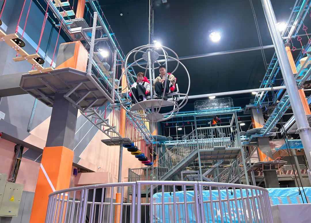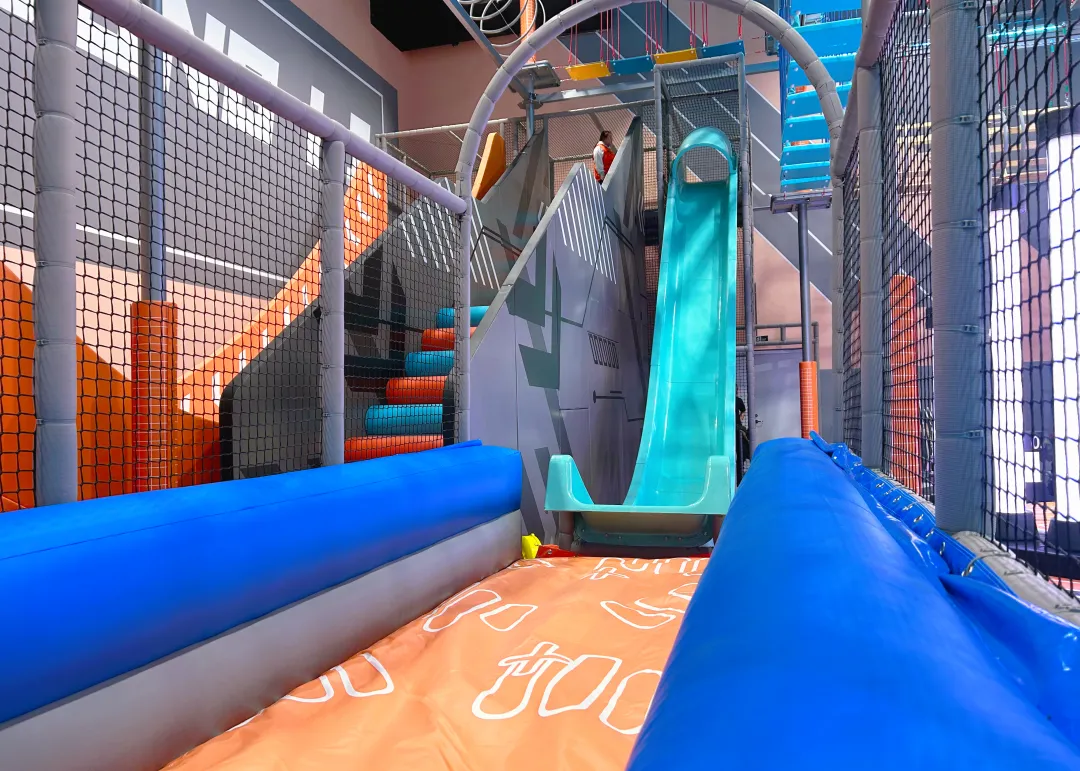 我们依托项目 9.5 米 + 4.5 米的双层空间结构,摒弃传统业态的平面布局思维,通过垂直空间分层规划,精准植入滑梯矩阵、高空魔网、无敌风火轮等 8 大功能模块,在 977㎡的场地内实现体验场景的最大化覆盖。