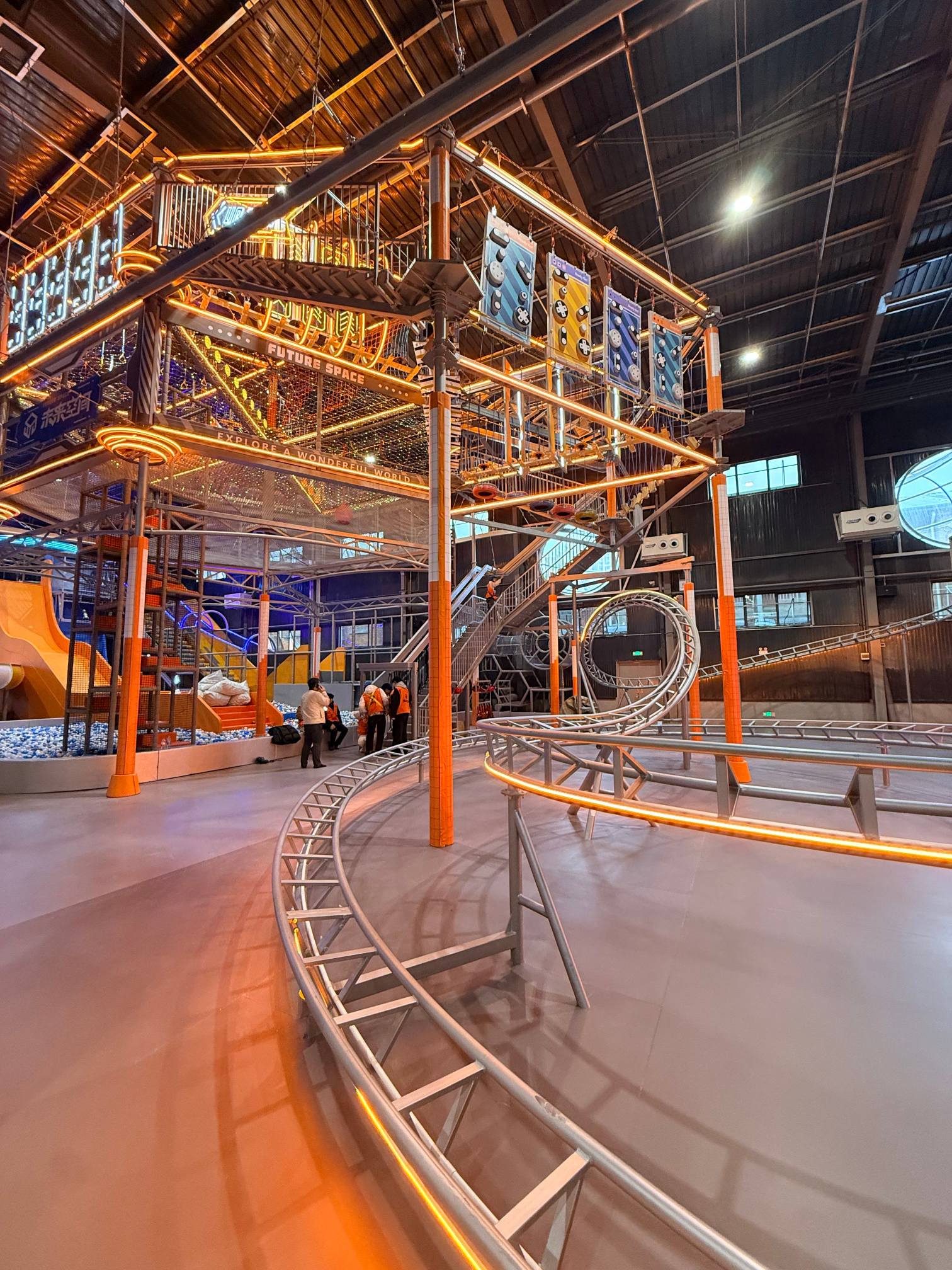 项目组合:嵌入式360自行车(蜜动自研爆款)、光轮摩托轨道(可同时运行空中飞人,节省空间),搭配主题造景区(如太空主题的双旋滑梯)。例如湖南益阳万达运动馆将360自行车嵌入入口,成为天然打卡点,开业首月客流提升25%。